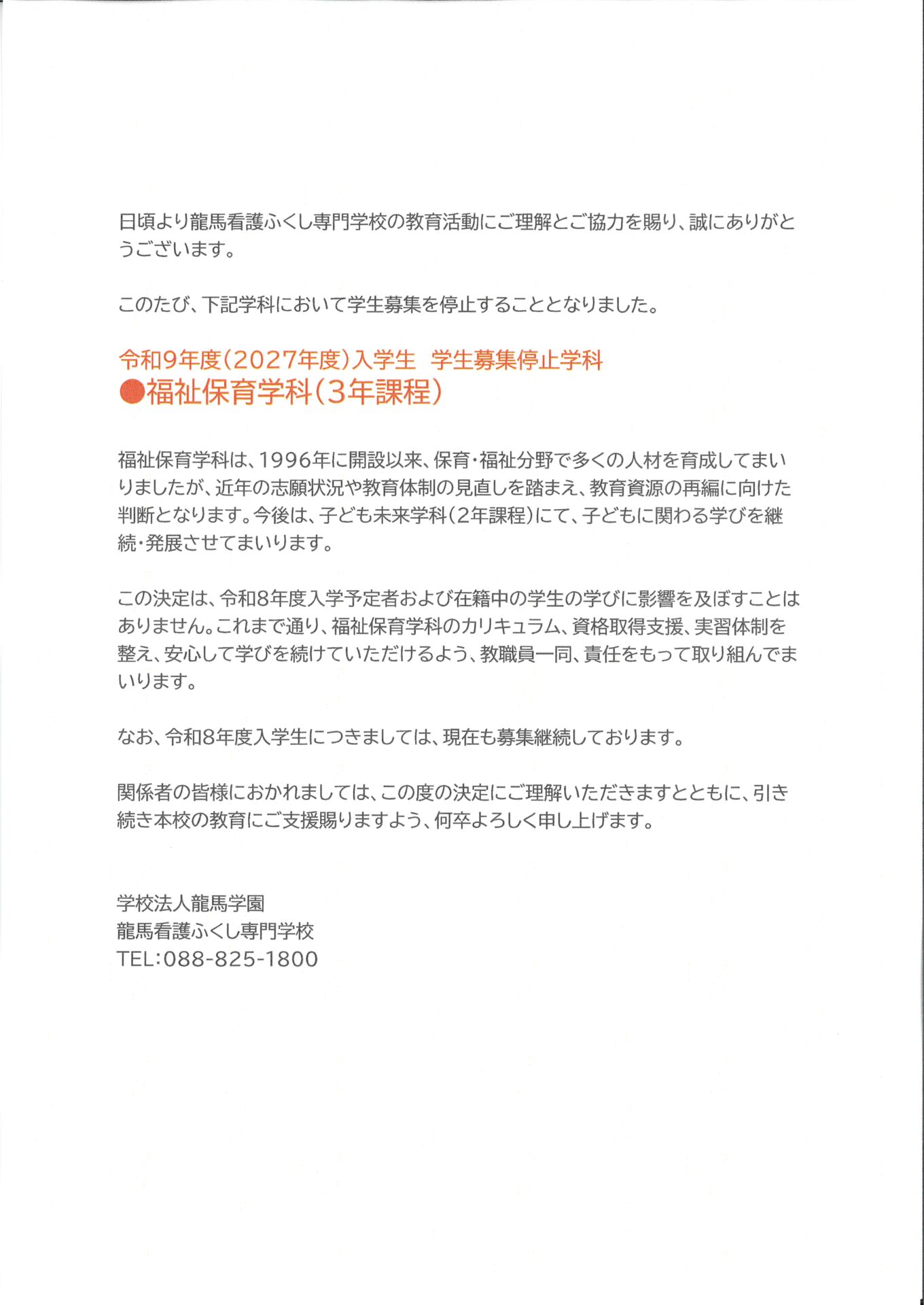 福祉保育学科 令和9年度入学生 学生募集停止のお知らせ