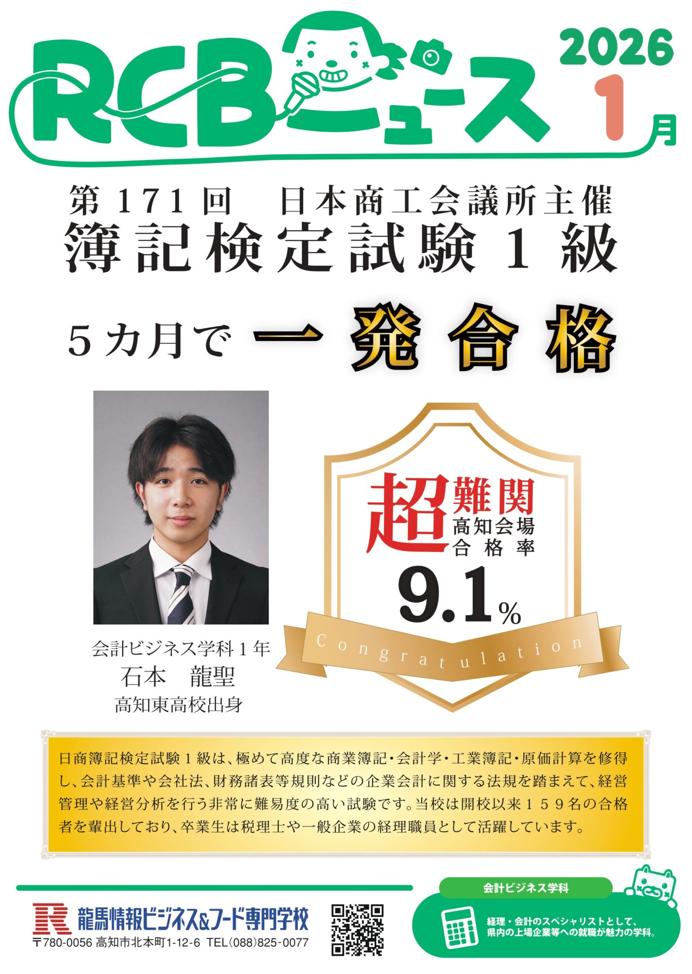 会計ビジネス学科の1年生が日商簿記検定試験1級に合格しました!